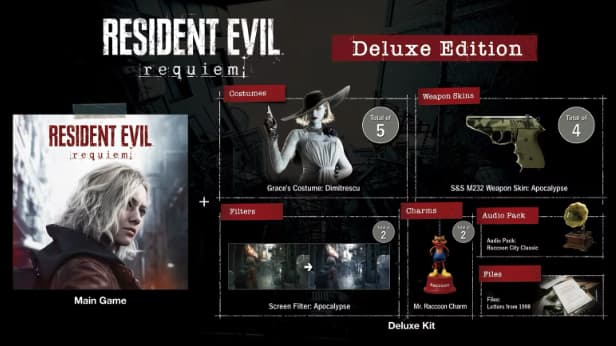 В издание Resident Evil Requiem Deluxe Edition вошли: базовая игра и набор Deluxe Kit с косметикой для главной героини, оружия, фото-фильтрами, а также другими приятными бонусами!