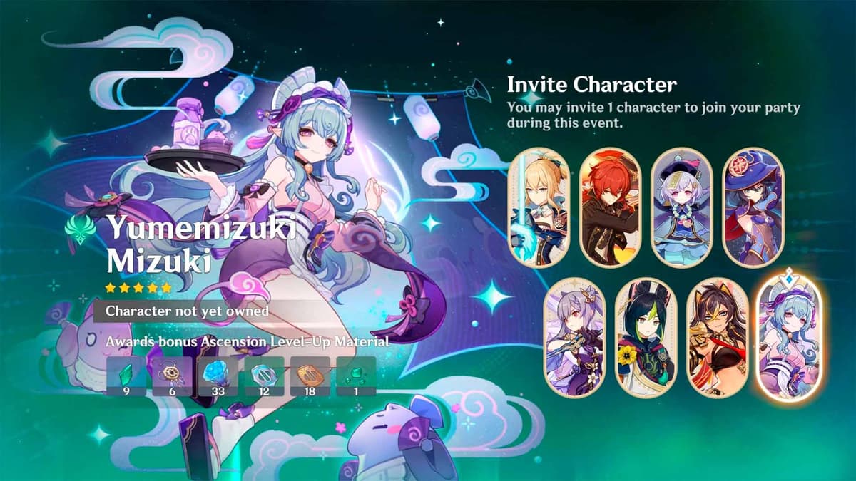 Доступны персонажи со стандартного баннера Жажда Странствий: Джинн, Дилюк, Мона, Ци Ци, Кэ Цин, Дэхья, Тигнари, Мидзуки. Можно взять дубликат — получишь созвездие. В комплект к выбранному герою сразу прилагаются материалы возвышения.