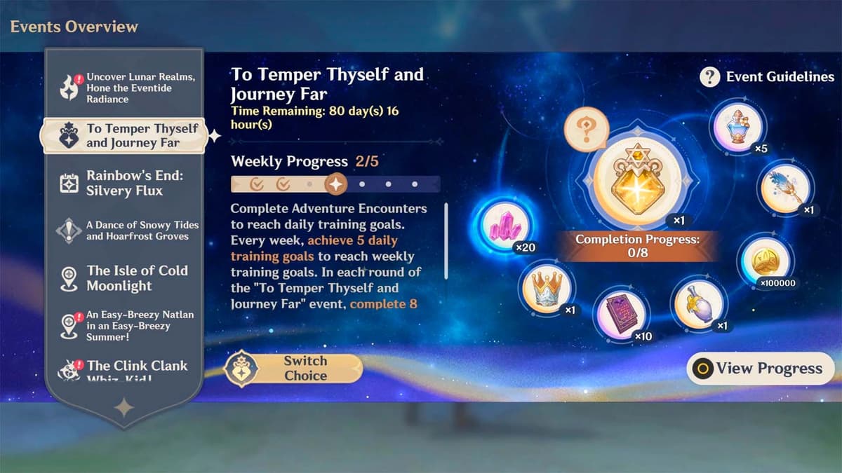 В прогресс засчитываются ежедневные поручения, трата 120 смолы в день, а также другие цели события — считай это лёгким прохождением.