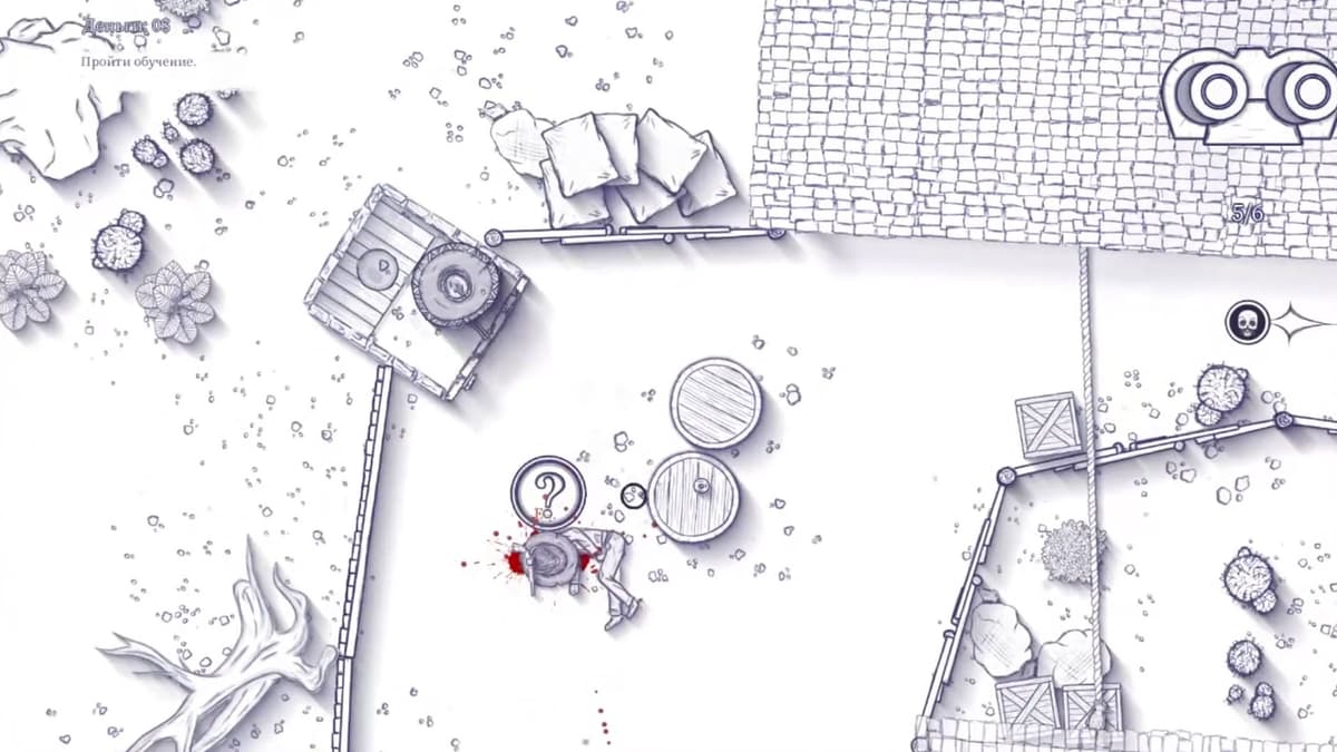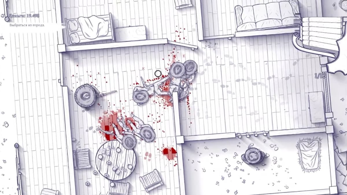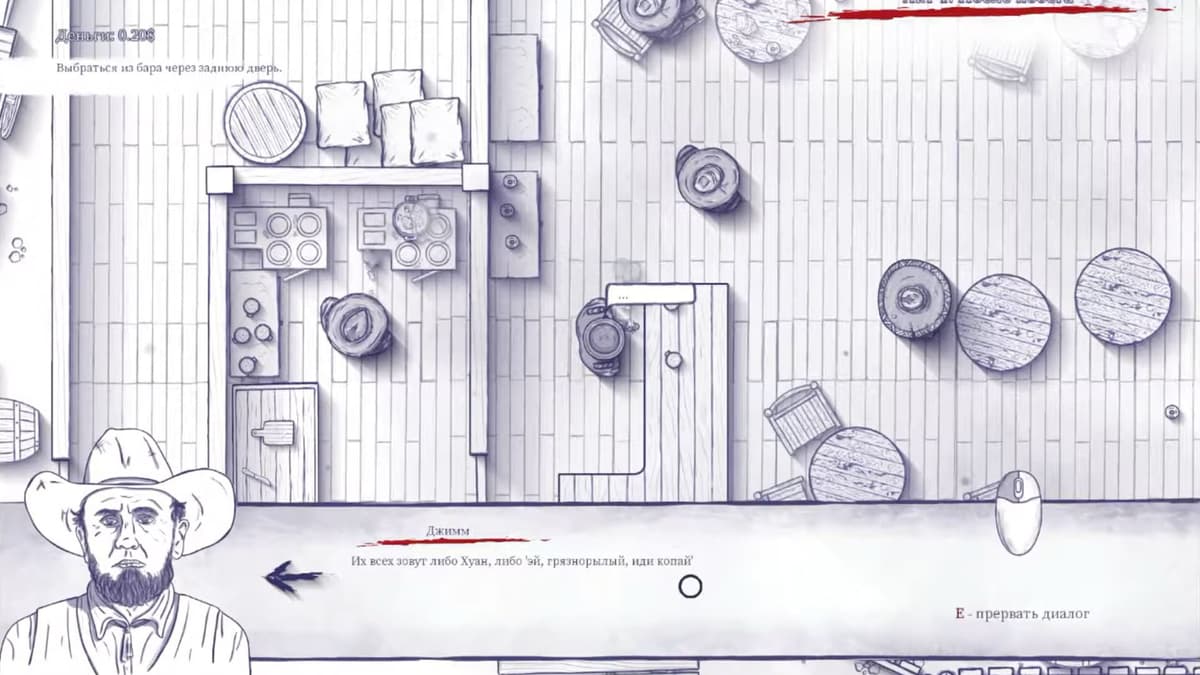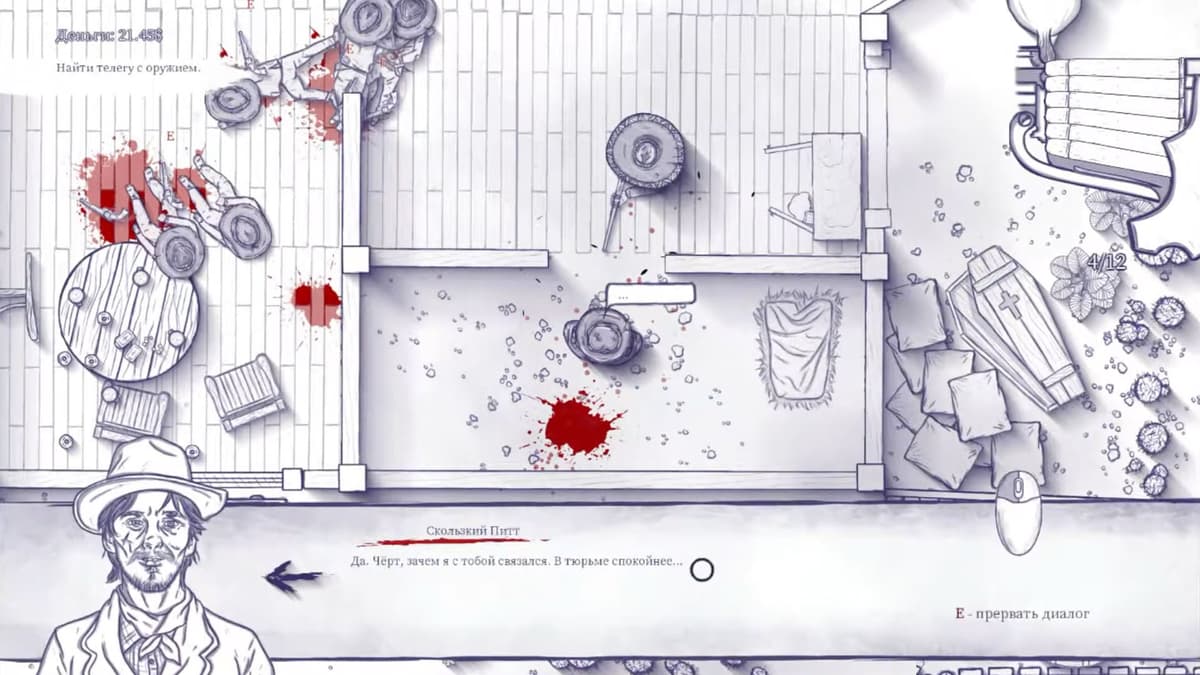 По части геймплея это ничем не прикрытый клон нашумевшей Hotline Miami. Вид сверху, динамичные перестрелки, продуманные локации, распиханные везде пачки врагов и кровище повсюду. Но выполнено всё это в сеттинге Дикого Запада, да ещё и полностью отрисовано от руки, словно гелевой ручкой в школьной тетради, что особенно подчёркивает появляющиеся по всему экрану брызги красной крови.
