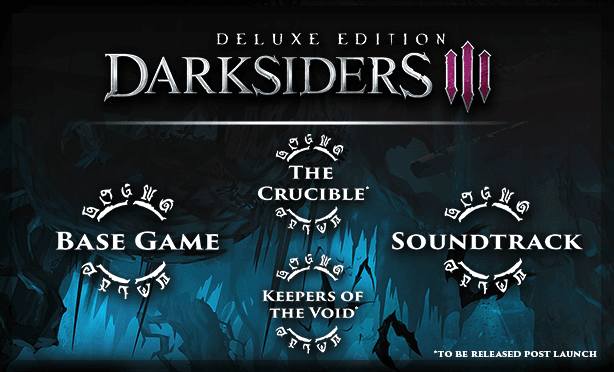 Издание Darksiders III – Deluxe Edition включает основную версию игры, а также дополнения The Crucible, в котором добавлена безжалостная арена с бесконечными волнами врагов, и Keepers of the Void с новой сюжетной линией и локацией. Приятным бонусом станет цифровой саундтрек!