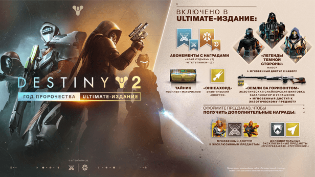 В набор Destiny 2: «Год пророчества» – Ultimate-издание входит: обе новые кампании, эксклюзивные предметы за предзаказ DLC, абонементы с наградами, а также наборы с экипировкой, оружием и экзотический жест!