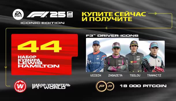 Издание F1 25 Iconic Edition включает в себя базовую версию игры, 18000 игровой валюты, набор-усилитель с расходниками, набор кумира Lewis Hamilton, а также несколько легендарных пилотов F3!