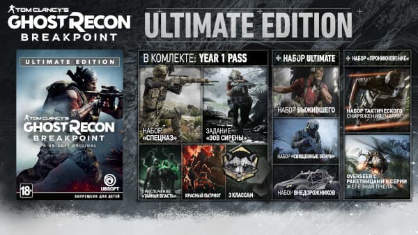 В набор Tom Clancy's Ghost Recon Breakpoint - Ultimate Edition входит: основная версия игры, весь контент Deluxe и Gold edition и три дополнительных набора с кастомизацией персонажа и техники.