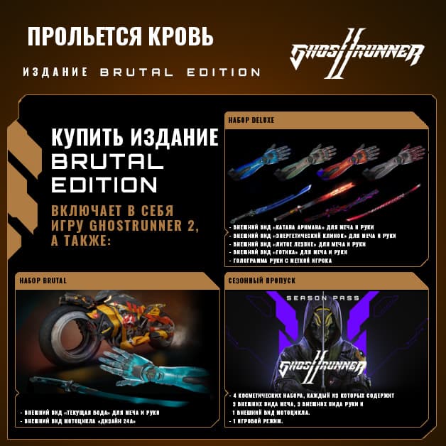 «Брутальное» издание включает базовую игру, анимированные скины для катаны, брони и байка, а также сезонный пропуск. Покупка издания Brutal Edition подарит не только эксклюзивный контент, но и шанс стать легендой киберпространства.