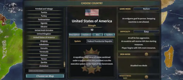 На пути к мировому господству вам придётся принять огромное множество действительно сложных решений. Первым станет выбор стартового государства. Возьмите под контроль Соединённые Штаты Америки или одну из стран центральной Африки, если хотите усложнить себе жизнь. Однако выбор страны — только начало пути. Теперь необходимо подобрать оптимальную для народа политическую систему, утвердить состав кабинета министров и проделать ещё гору административной работы.