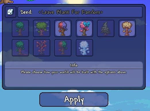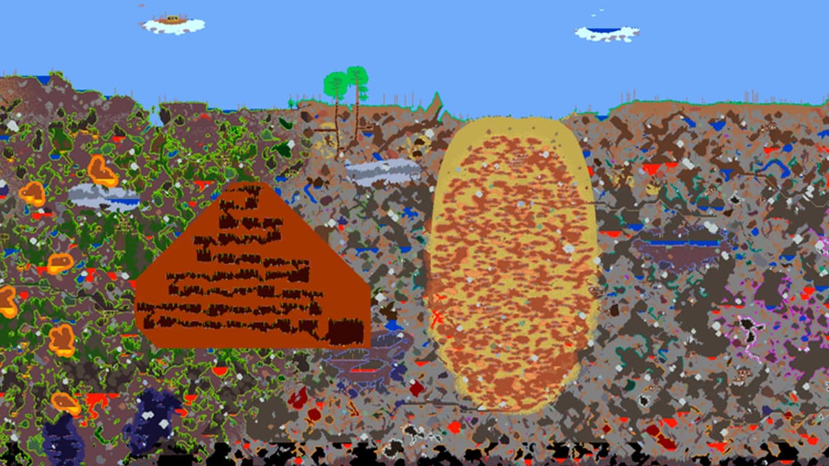 Содержит неприличное количество лута рядом со спауном. Ботинки хождения по воде лежат в сундуке у восточного океана, неподалёку можно найти Эглет, Ножной браслет ветра, Коньки и Амулет лавы. Рядом с точкой спауна в первый же день появляется синий слайм с Посохом слизней — один из самых редких дропов на старте игры. Подходит для больших миров с Кримзоном на Master Mode.