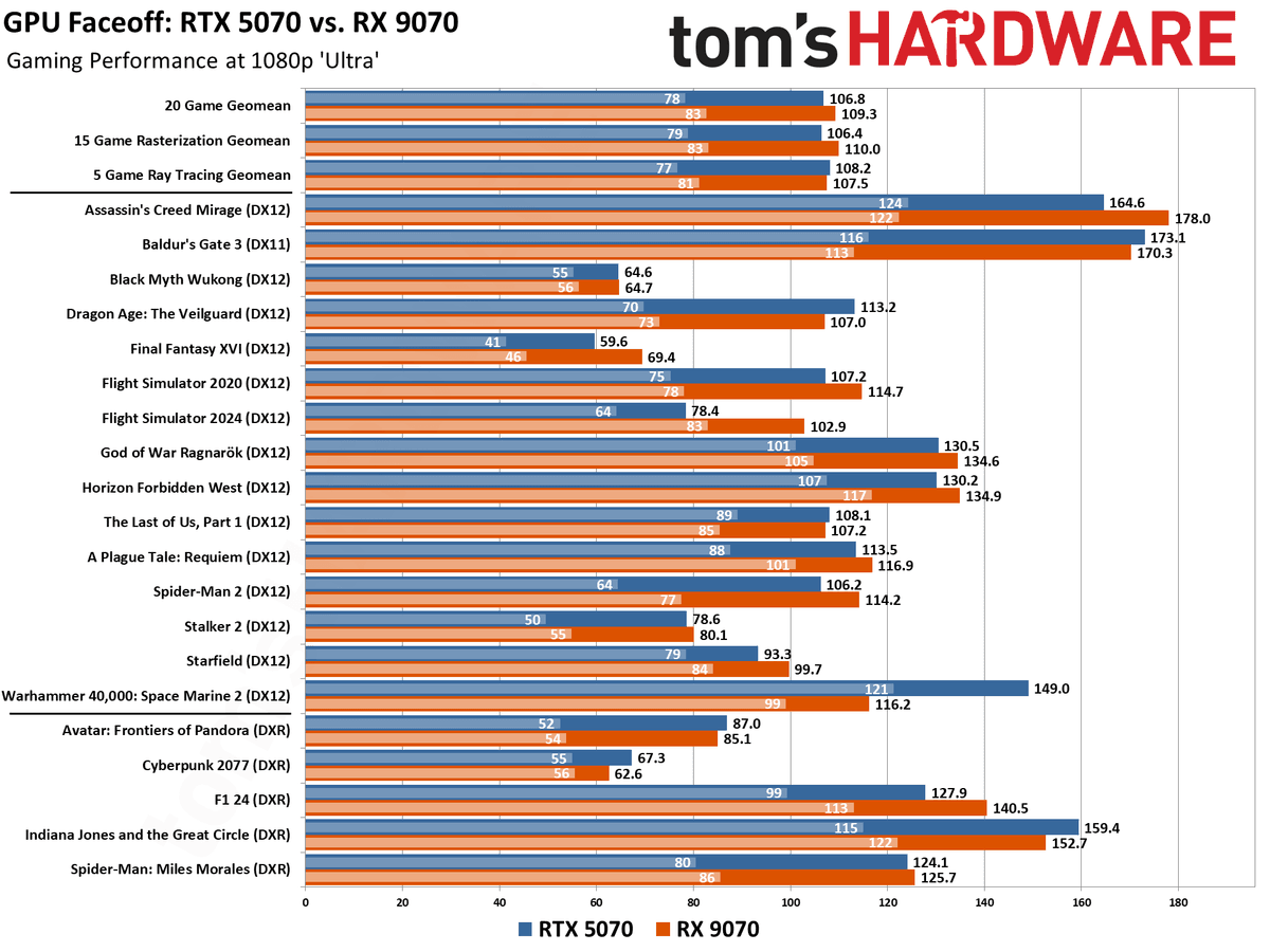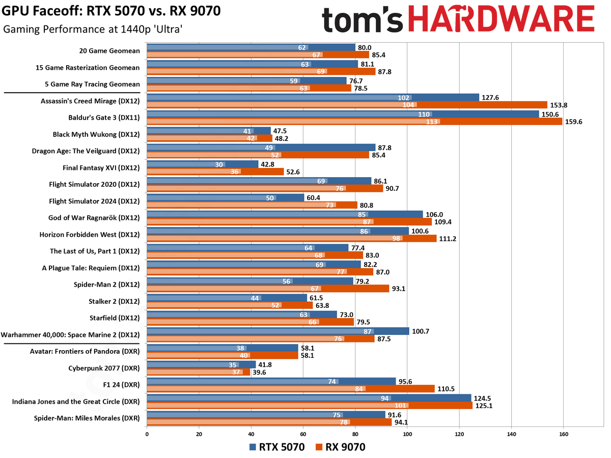 1440p: RX 9070 показывает преимущество в среднем на 8% по сравнению с RTX 5070.