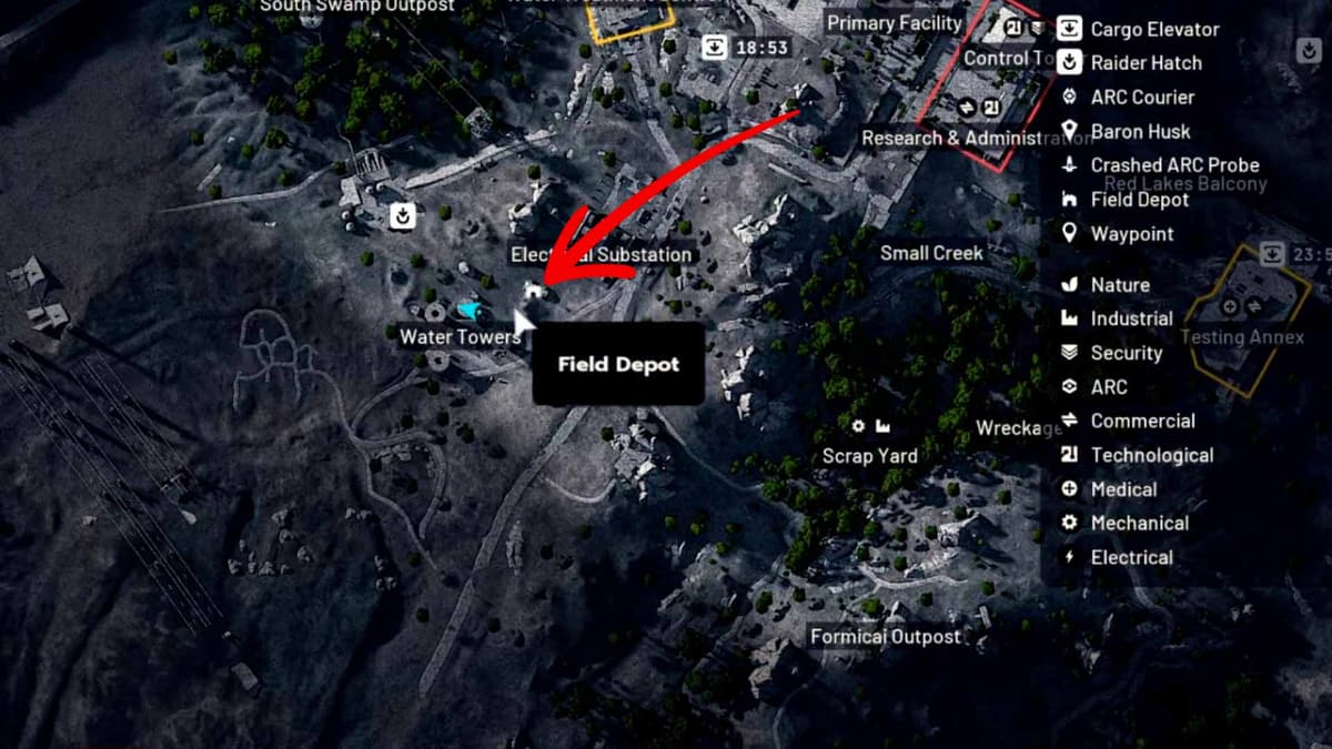 Полевое депо — небольшая точка интереса (POI) на каждой карте. Это компактный форпост с высокой антенной. У него есть иконка на карте, так что маршрут можно прикинуть ещё на старте рейда.
