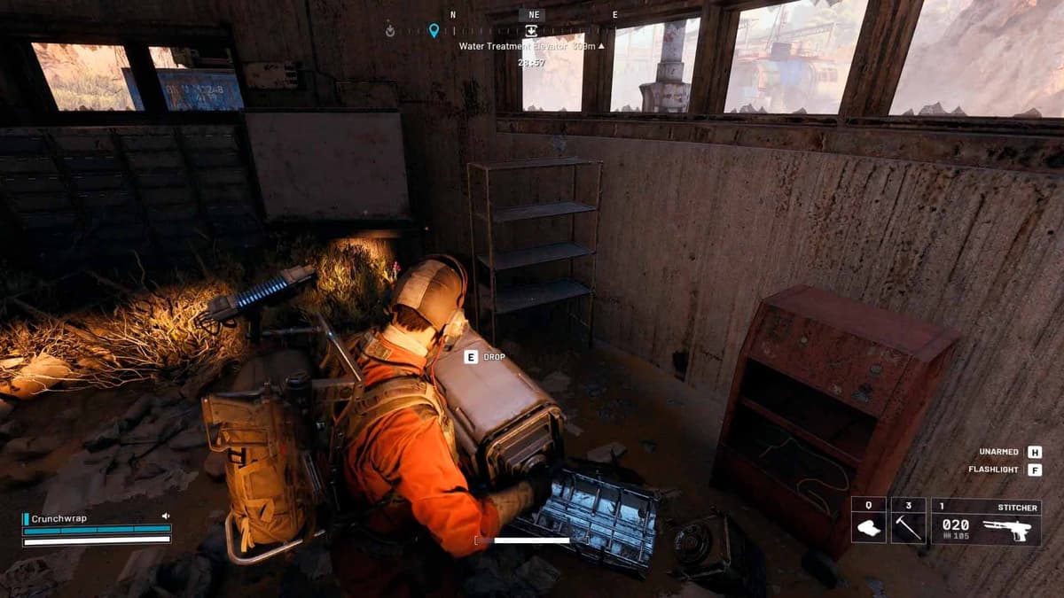 Пока несёшь, будешь двигаться медленно и не сможешь защищаться. Дойди до подсвеченного места — контейнер разблокируется. Внутри обычно лежат патроны, ресурсы и материалы для крафта.
