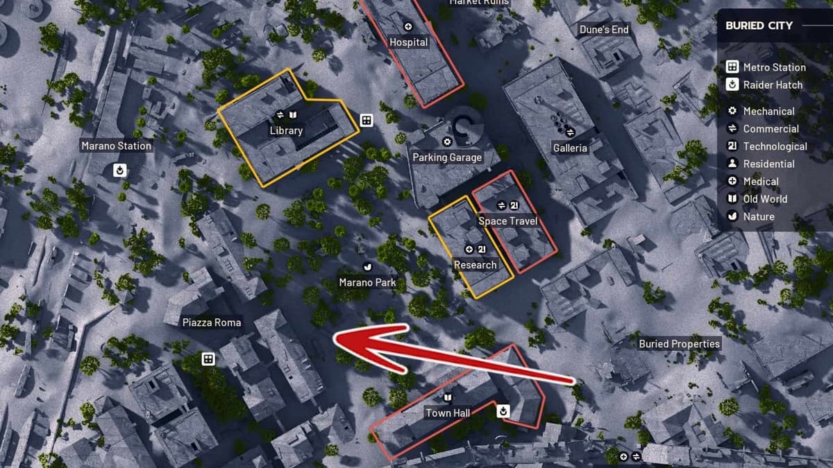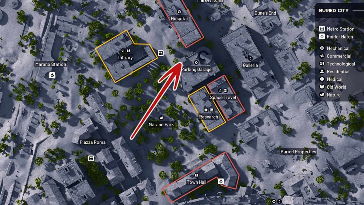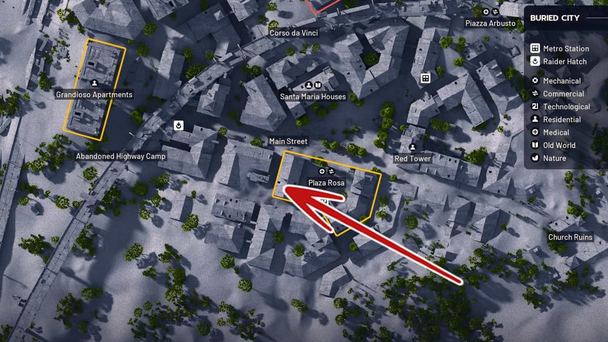 Находится на северной стороне Погребённого города. Подойти можно откуда угодно, но тебе нужно попасть внутрь лестничной клетки на северо‑западной стороне здания.