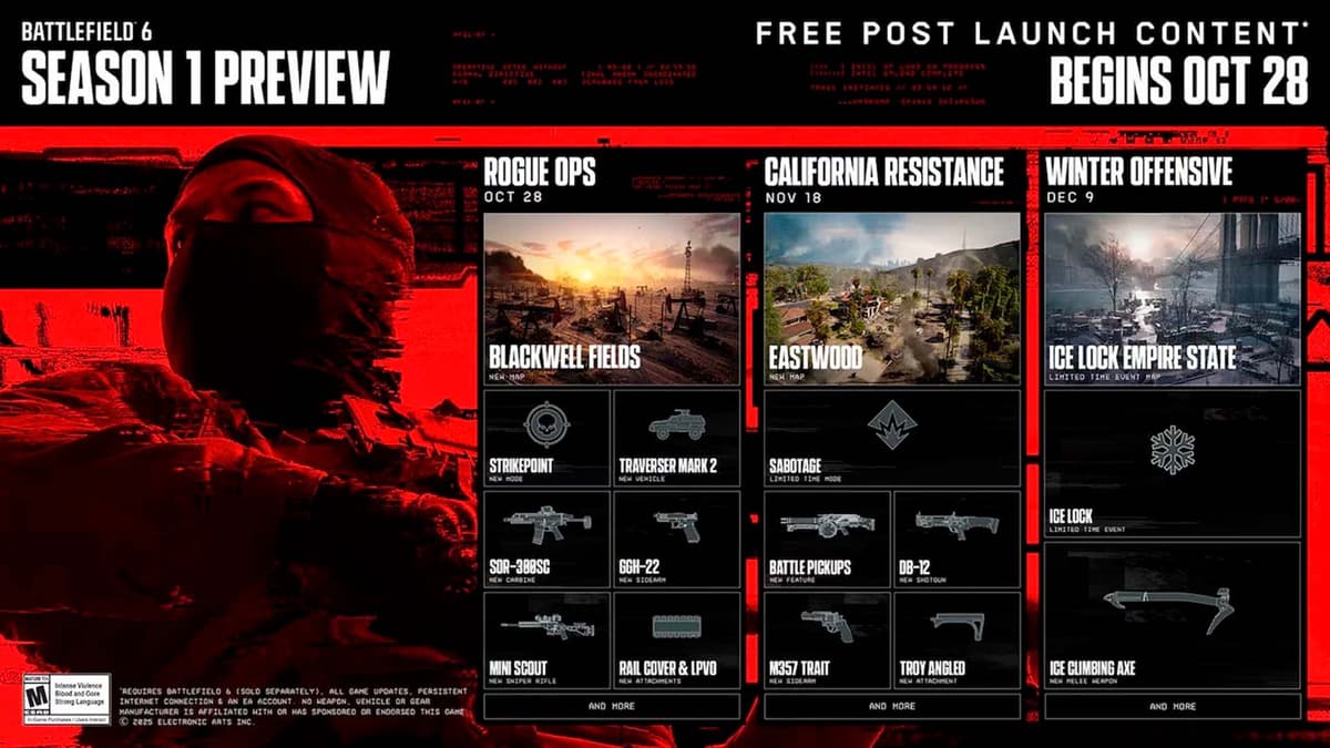 Поиграл во все мультиплеерные режимы, присмотрелся к четырём классам и собрал любимые сборки? Самое время заглянуть вперёд. EA и Battlefield Studios показали дорожную карту первого сезона Battlefield 6. Смотри, что появится в ближайшие месяцы.