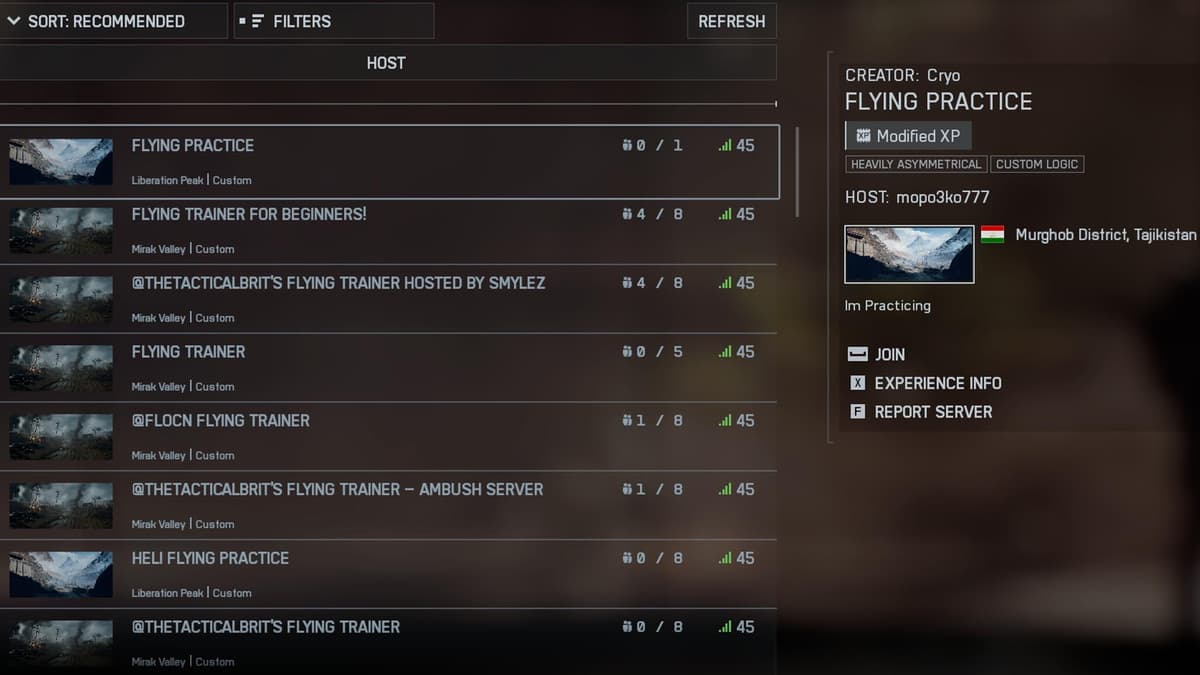 Если хочешь гарантированно научиться летать, используй режим Portal. Открой браузер серверов, в поиске набери Flying (часто так и пишут «flying trainer/practice»), отсортируй — и найдёшь кучу «малонаселённых» лобби с воздушной техникой: вертолёты и истребители (джеты) без очередей.