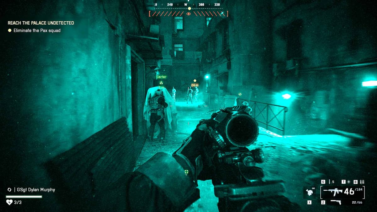 Подожди, когда он пройдёт под фонарём, потом подкрадись сзади и тихо выруби врага. Продолжай двигаться с отрядом. Скоро Картер скомандует устранить группу из четырёх солдат, перегородивших путь. Подкрадись поближе, выбери любого и аккуратно прострели ему голову. Твои напарники в ту же секунду снимут остальных.