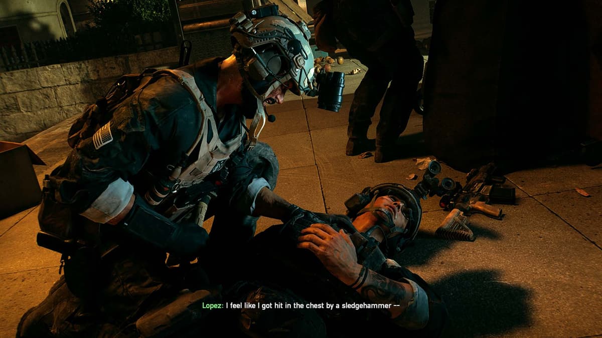 Лопес ранен, из-за чего отряд движется медленно. Бойцы относят его в ближайшую лавку и укрывают внутри, а затем возвращаются в бой. На крышах по ту сторону площади появляются новые снайперы — используй укрытия и свои рентген-очки, чтобы вычислить их силуэты и отметить для команды.