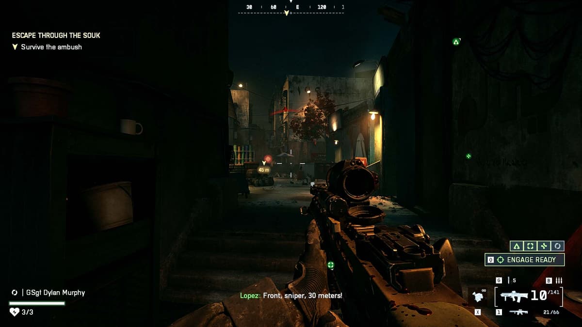 Подходят всё новые и новые враги — держись ближе к своим, чтобы противники не зашли сбоку. Не высовывайся: если подпустить солдат к рыночным рядам, они сами собьются в кучу, и их легче накрыть. Не забывай про Engage (пометку врагов для себя и команды). После последней волны возвращается вертолёт и начинает поливать площадь огнём. Быстро беги в ближайшее здание и спрячься внутри.