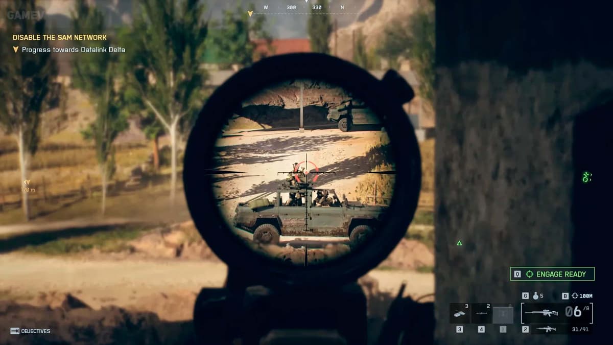 Срабатывает тревога: на горизонте движется колонна. Тебе выдадут Switchblade — поведёшь огонь по технике. Цели простые: три джипа и танк. По танку нужно два попадания.