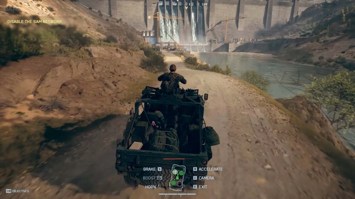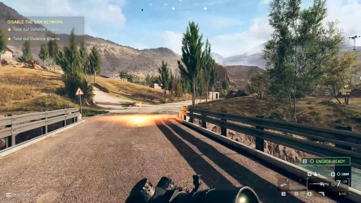 Когда обе ЗСУ превратятся в металлолом, по тебе начнут работать танки с обоих концов дамбы. Беги к решётке по маркеру — ролик: Dagger 1‑3 спускаются на верёвках и угоняют грузовик. Через секунду — авиаудар и взрыв плотины.