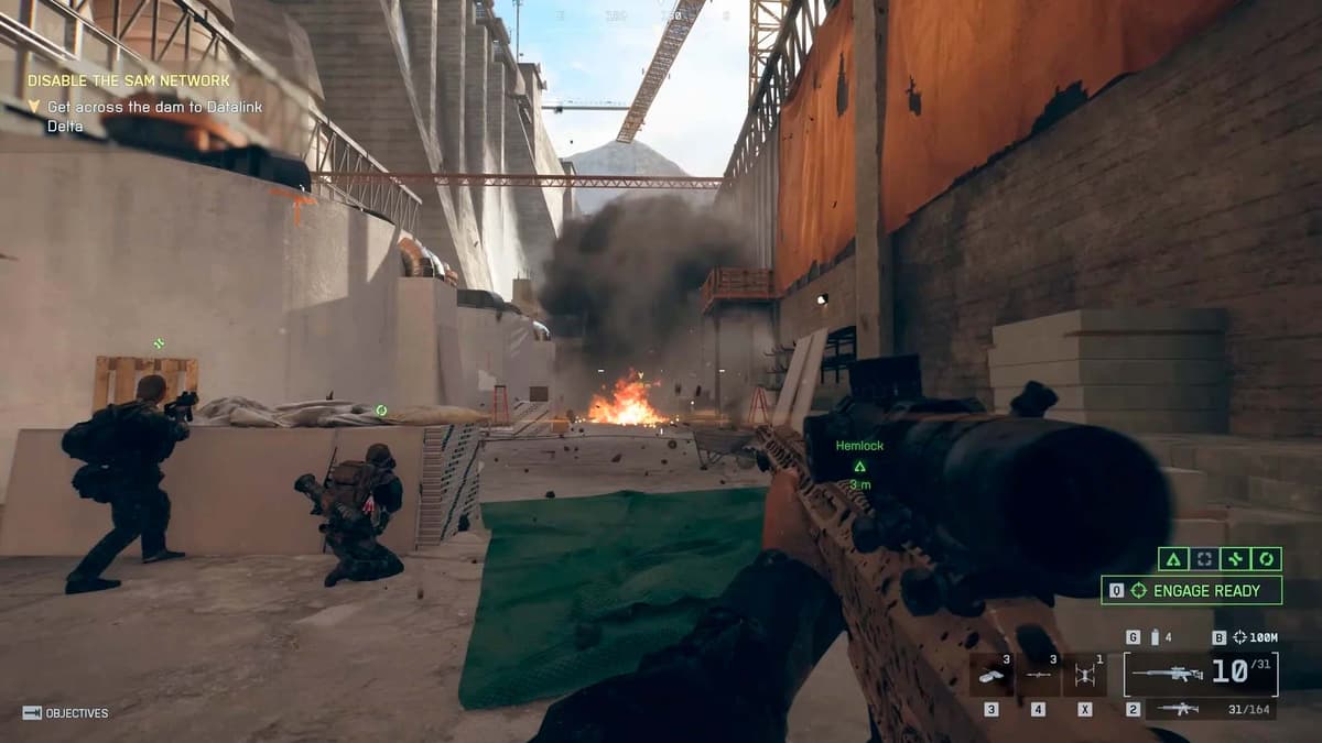 Придётся перейти на другую сторону, чтобы добраться до Дельты. На плотине врагов немного, но они приходят волнами и любят прятаться. Принцип тот же: не высовывайся, отмечай цели дроном, чисти аккуратно. Если огонь прижимает — отступи на шаг, переведи дыхание и вернись к размеренному темпу «из‑под укрытий».