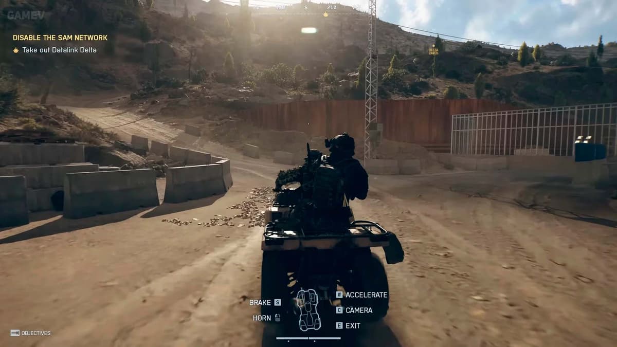 Под гребнем сойди с квадроцикла, иначе влетишь в засаду. Дрон — в воздух: отметь стоянку впереди и взорви её. Дельта стоит открыто; если взял РПГ, платформу можно снести издалека ещё до финальной зачистки.