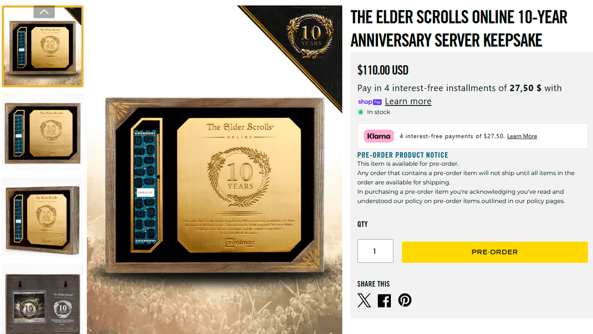 Прямо сейчас а честь десятилетия The Elder Scrolls Online можно предзаказать реальный фрагмент сервера ESO — палку RAM с настоящего оборудования MMO, запаянную в декоративную рамку. Цена — $110, доставка — в июле 2025.