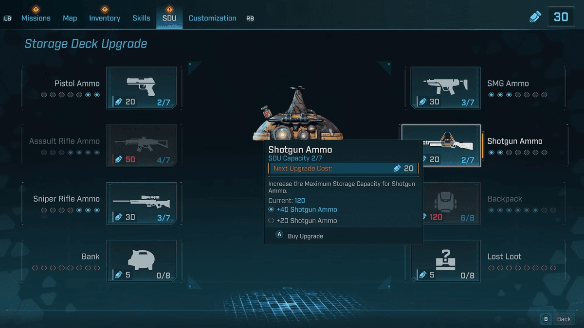 Чем больше патронов, пушек и других предметов ты можешь носить с собой — тем лучше. Поэтому обязательно вложись во вместительность инвентаря. В Borderlands 4 для этого нужно воспользоваться специальным меню улучшения, в котором ты должен отдельно выбрать, для каких предметов тебе особенно не хватает места.