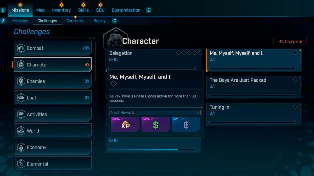 Загляни в меню «Миссии» → соседняя вкладка «Испытания». Здесь лежит целая лента заданий на любой вкус: убийства, сборы, активити. За них падают эридий, XP и лут, а список регулярно обновляется — отличный фоновый фарм, когда хочется «почистить» карту между сюжетными рывками.