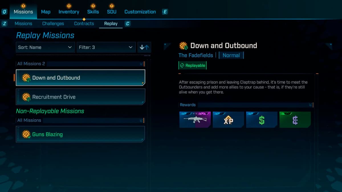В конце списка в меню «Миссии» ты найдёшь реиграбельные задания. Это сюжетные эпизоды, которые можно переигрывать ради XP, лута, денег и эридия. Дольше, чем контракт или испытание, но окупается, если нужна крупная заправка кошелька.