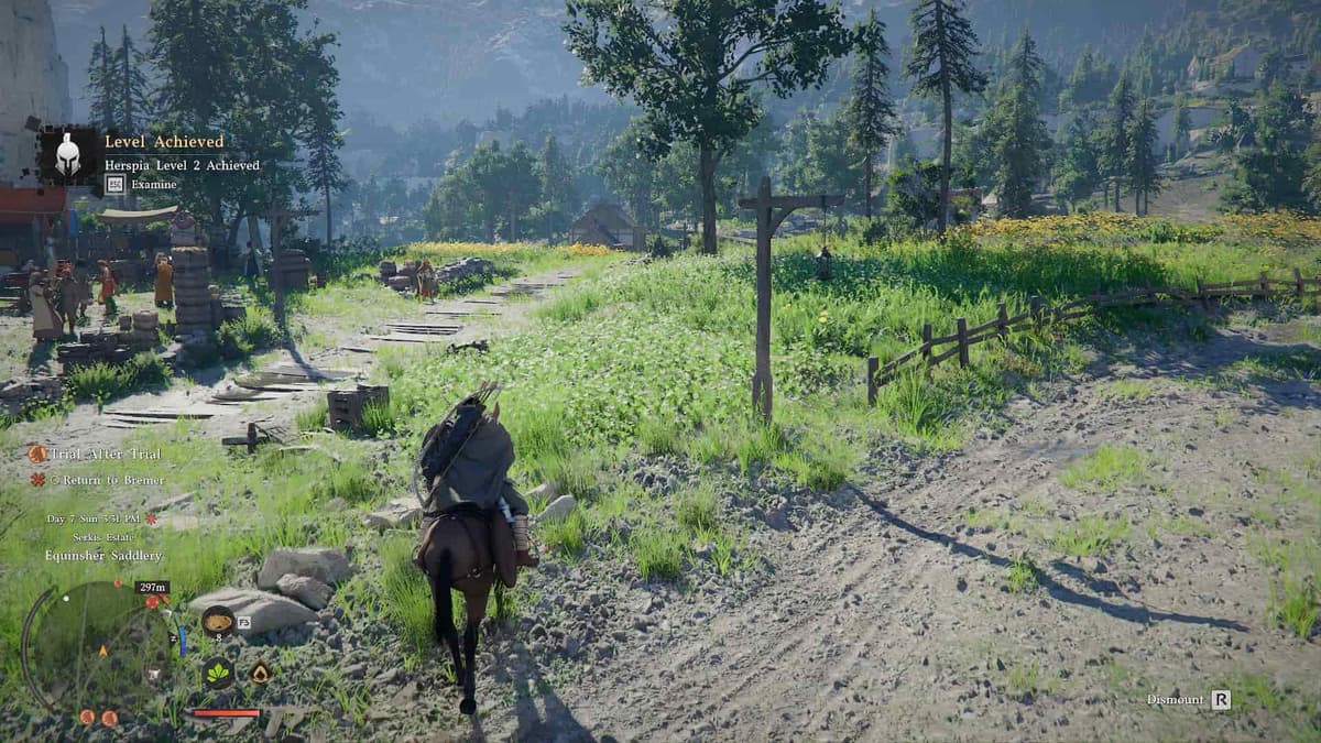 Стартовый конь в Crimson Desert не особо впечатляет, но его можно и нужно улучшать. Просто надо ездить на нём везде. Со временем у него повысится уровень и откроются новые способности: спринт, дрифт, удар копытом, плавание и даже двойной прыжок. До второго уровня конь прокачивается быстро. Как только получишь рывок — перемещаться по миру станет гораздо удобнее.