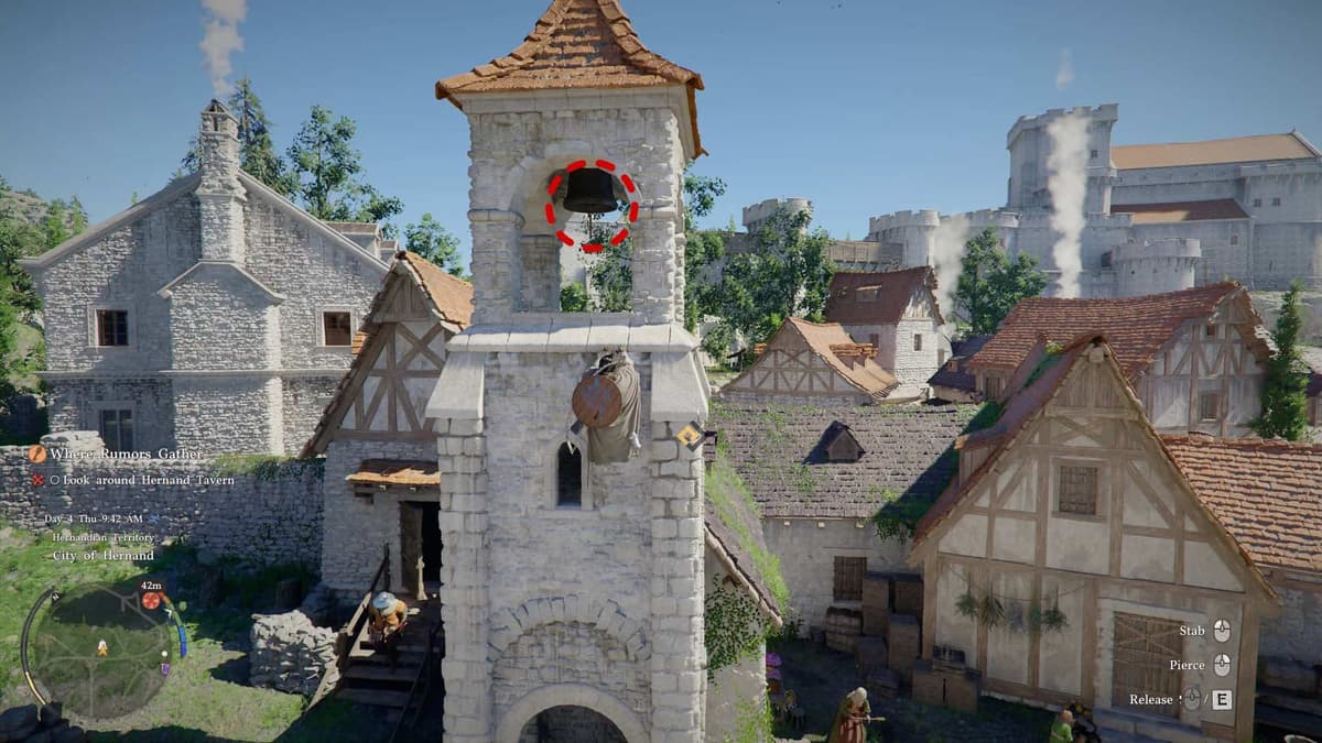 Если посмотришь на мини-карту, когда будешь бродить по городу Эрнанд, то заметишь иконку колокола. Она висит на башне в центре. Игра не говорит, зачем это нужно, а зря — механика крайне полезная.