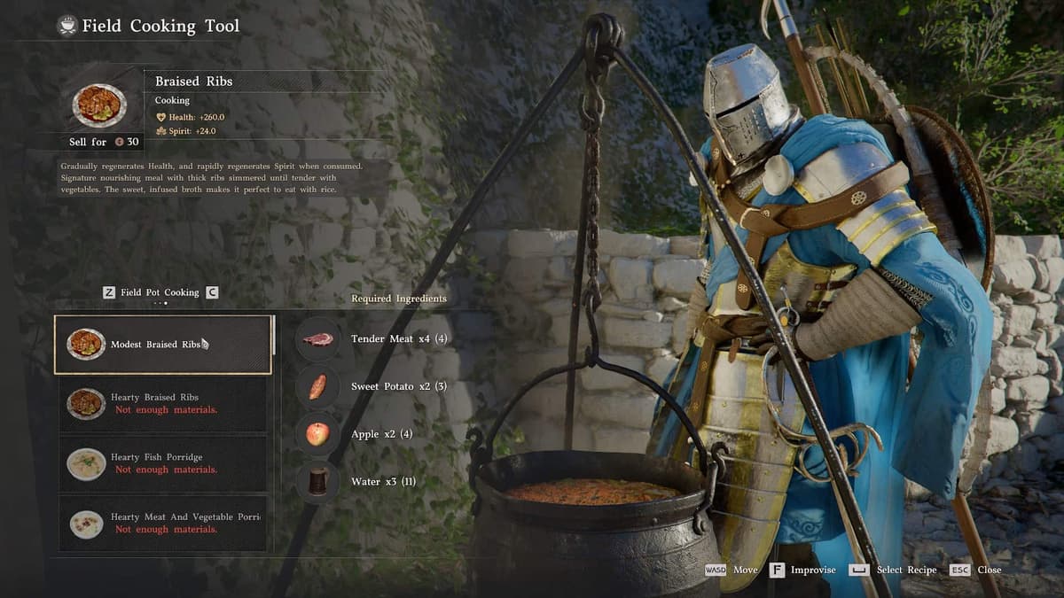 Готовая еда восстанавливает здоровье, выносливость и дух. А сложные блюда из нескольких ингредиентов дают ещё и баффы перед боем. Очень полезно в схватках с боссами в первых главах.