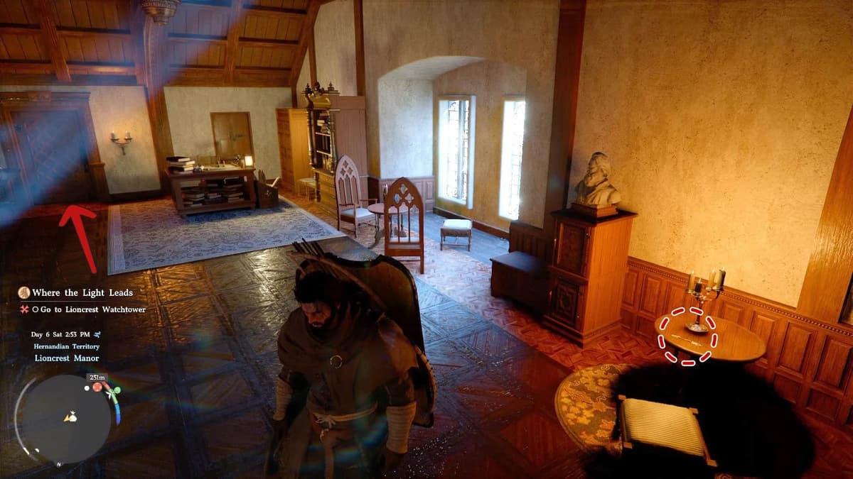 Нужное место — поместье Лайонкрест в северной части города. Главное здание — это золотая жила: там и сундук с Тяжёлым щитом, и головоломки, и навыки. Но тебе важно другое — каменная пристройка к западу от главного особняка.