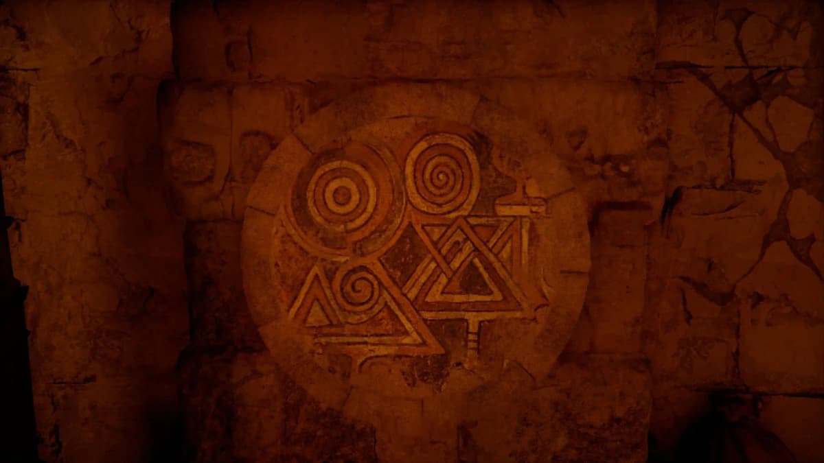 Главная подсказка находится снаружи. Фрески в трёх комнатах связаны с пугалами, которые стоят рядом с руинами примерно в пределах 600 метров. Тебе нужно найти эти пугала и посмотреть на рисунки у них на спине и на земле под ними. Символы совпадают, так что ошибиться сложно.