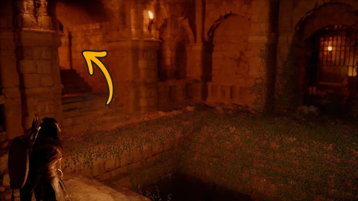 Ищи снаружи небольшой разрушенный участок, заросший колючими ветками. Сожги их через Ослепляющую вспышку, потом спускайся по лестнице вниз.
