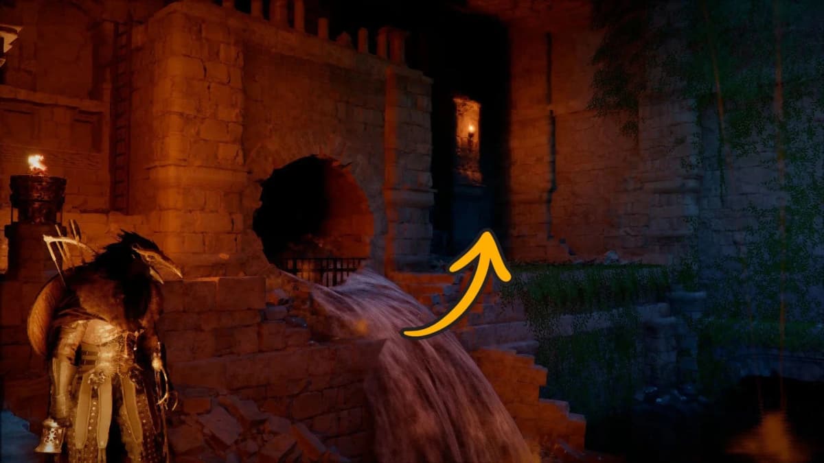 Важно: как только зайдёшь в руины, сразу смотри по сторонам — в коридоре стоят огненные ловушки, которые бьют из стен.