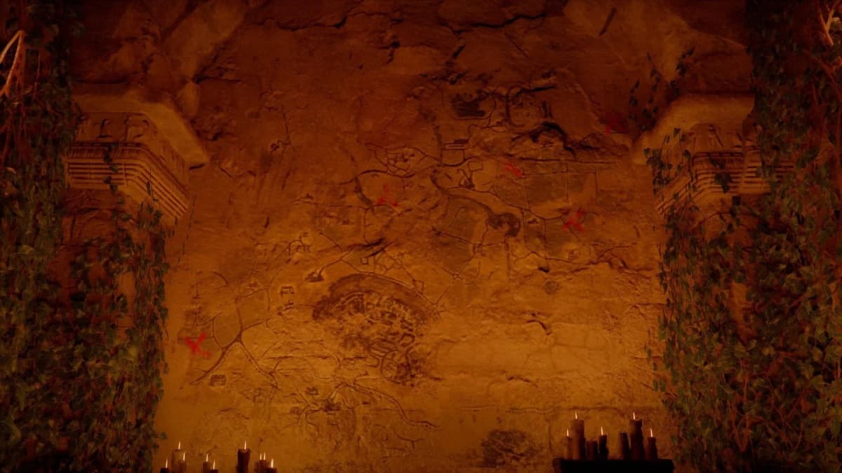 Дальше пройди через ворота в комнату. Там на стене будет карта с пятью крестами. Это и есть главная подсказка к загадке.