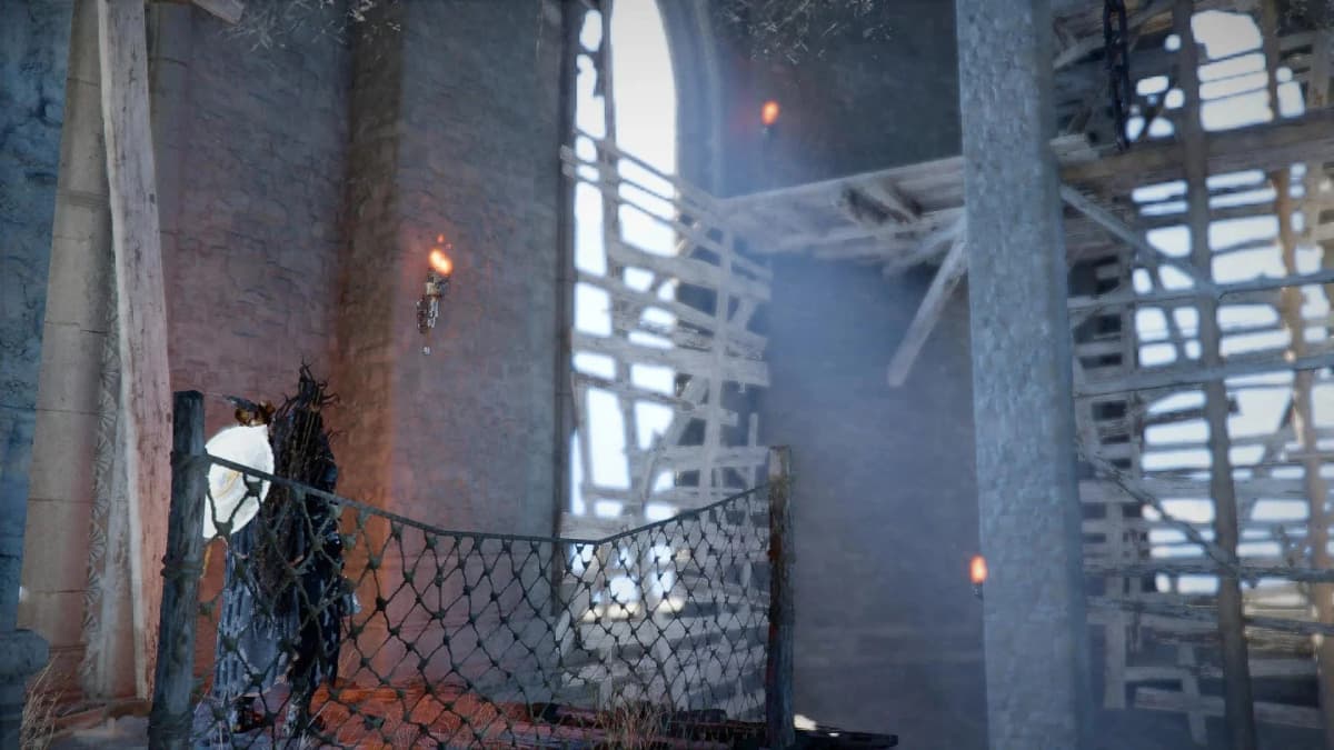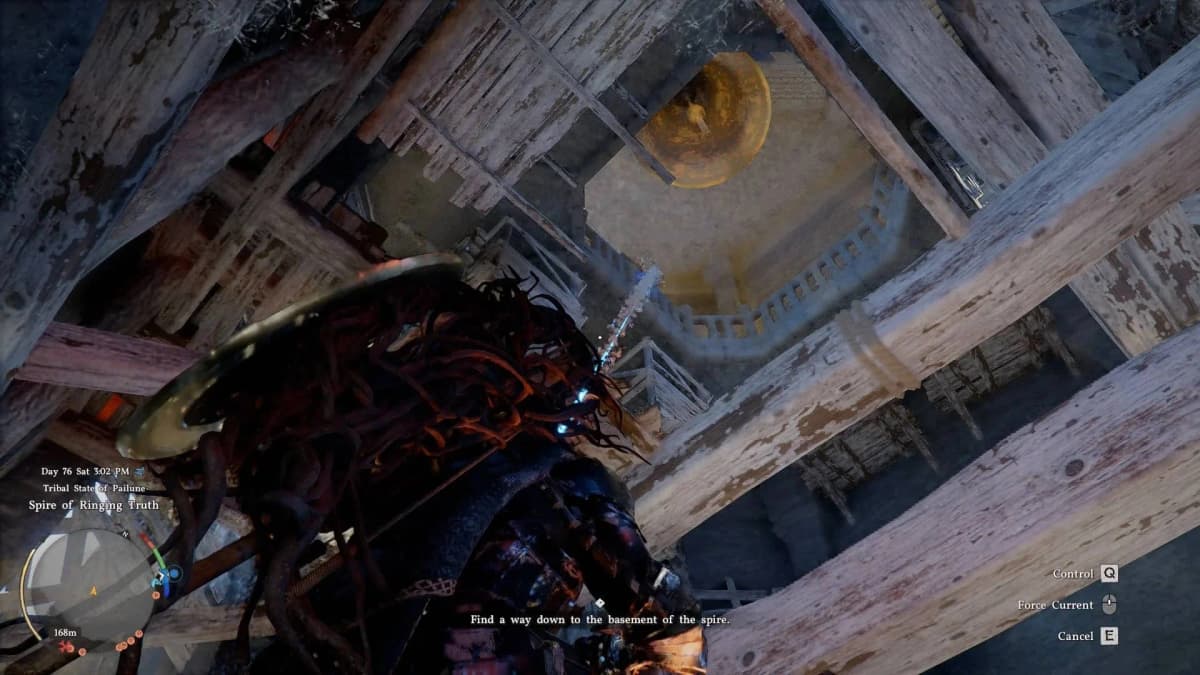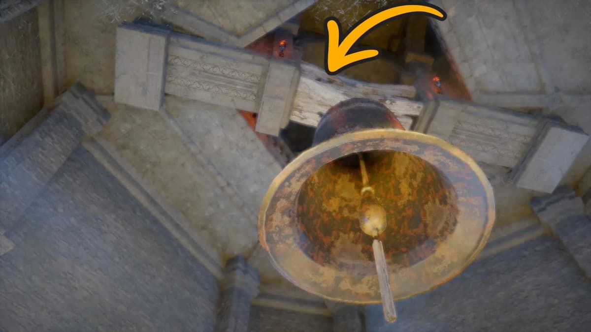 Целься Силой Аксиомы в прогнившие доски рядом с ним. Колокол рухнет вниз и пробьёт дыру в полу, открывая путь в подвал. Прыгай следом, а потом иди на запад — там тебя ждёт синий портал и босс по имени Прискус Древний.