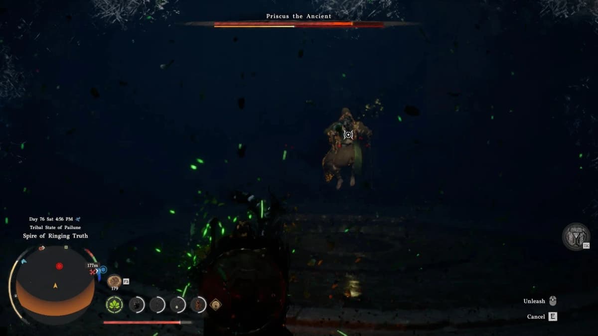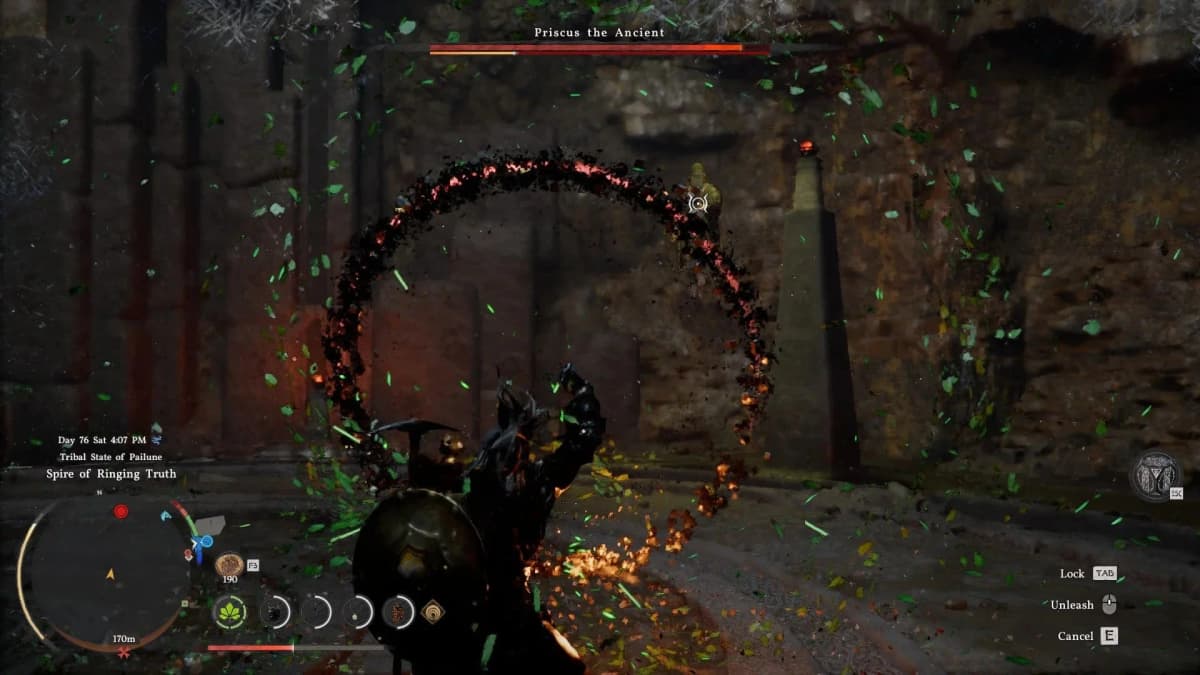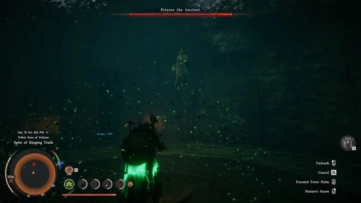 Начинай бой агрессивно: подбегай и бей Прискуса, пока он не улетит. Потом отходи в центр арены и включай Фокусировку. Как только босс поднимет руки для атаки — активируй Покров природы. Через пару секунд, когда угроза минует, жми Освобождение Силы Аксиомы, чтобы нанести ответный урон.