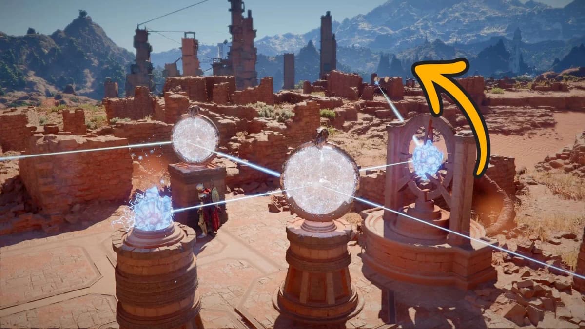 Солнечный шпиль расположен в регионе Багровая пустыня, а именно в Пустошах Предтечи. Чтобы добраться до него, нужно продвинуться по сюжету до 9-й главы — по квестовой цепочке Мудреца пустыни до задания «Истёршийся клинок — Перекрёсток». Как только оно появится в журнале, смело отправляйся к башне.
