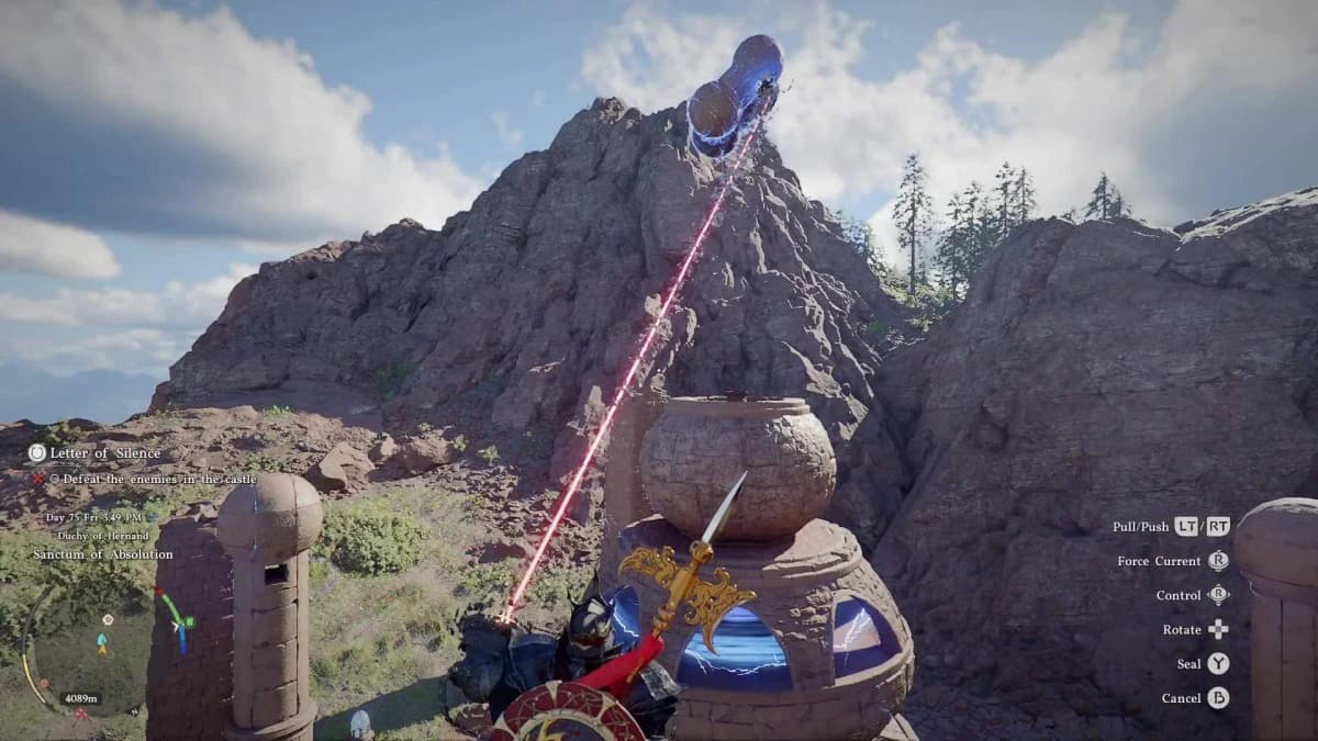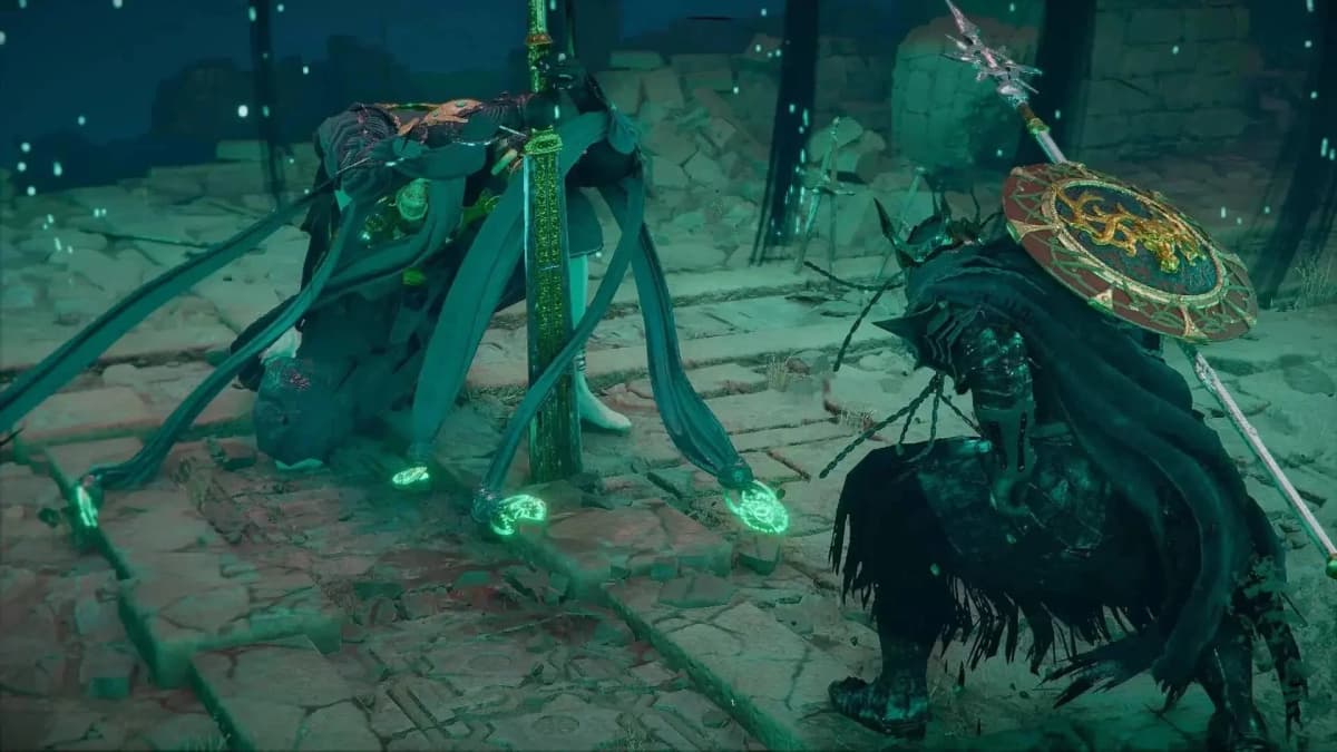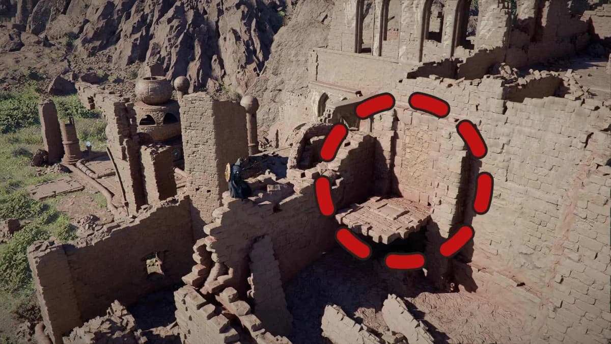 Как их забрать: заберись на восточную сторону святилища. Там будет выступ в стене с маленьким каменным квадратом по центру. Атакуй Ударом Пальмары стену напротив — стена провернётся, и ты свалишься в небольшую каморку. Открывай сундук и забирай поножи.