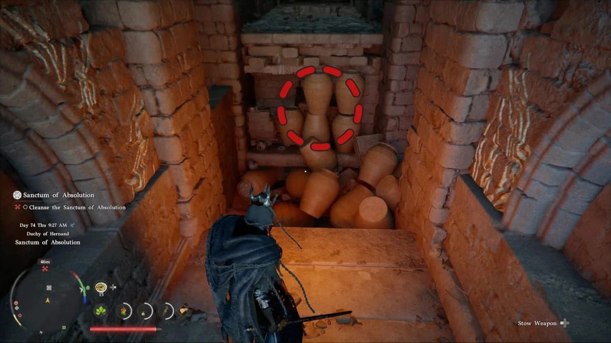 Второй — на противоположной стороне руин, в дверном проёме, который выходит на арену, где ты дрался с боссом. Там длинный коридор, а в центре — много глиняных горшков. Разбей их — под полом найдёшь блок. Опять поднимай его Силой Аксиомы — и в горшок.
