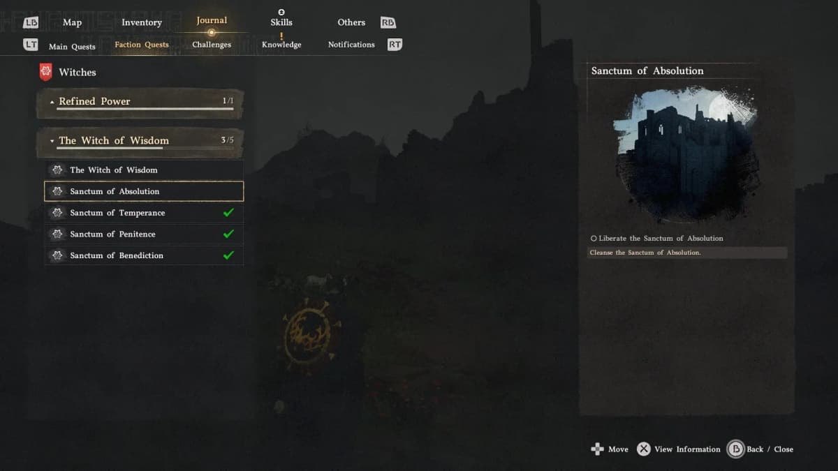 Святилище всепрощения откроется только после начала квеста фракции Ведьм «Ведьма мудрости». Эловен попросит очистить четыре святилища. Так что сначала доберись до квеста.
