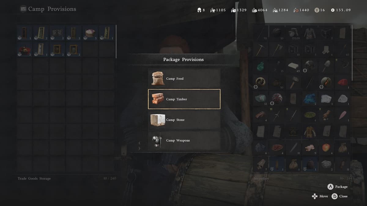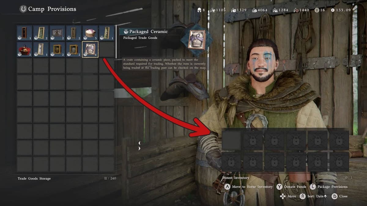 Когда призовёшь лошадь и поговоришь с Эдом в лагере, появится опция «Загрузить груз». Ты сможешь выбрать любой упакованный товар со склада лагеря. Проблема в том, что у большинства лошадей всего одна свободная ячейка для груза.