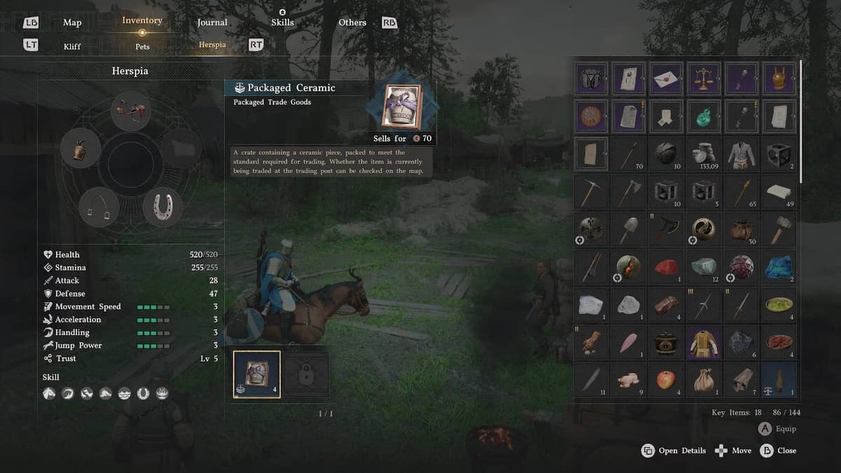 Как только ты попадаешь в Эрнанд, то начинаешь находить предметы синего цвета с иконкой весов. В игре они называются торговыми товарами. Это неупакованная версия. Их можно продавать в малом количестве — для этого нужно найти Торговый пост Золотого Листа.