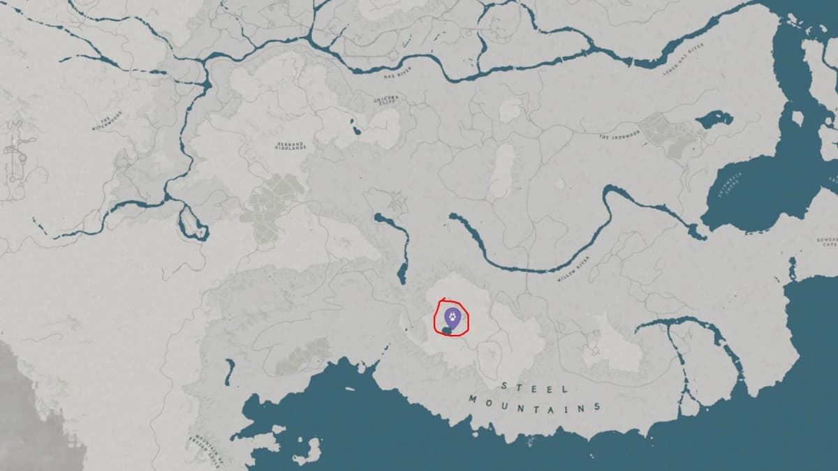 Находится в южной части карты, у Стальных гор, около Шпиля озарения. Пасётся у озера южнее сооружения.