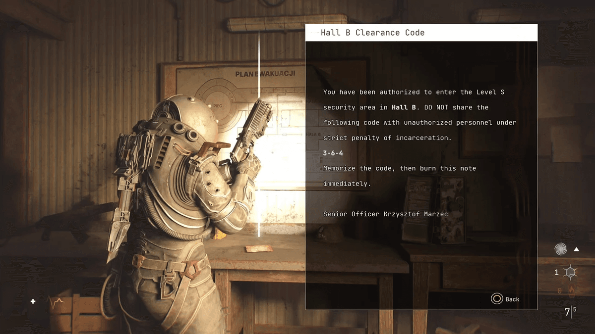 Код 3-6-4 можно найти справа от запертой двери в разгрузочном доке. Пройди в локацию «для персонала» и вглубь офиса на верхнем этаже — в конце наткнёшься на записку с комбинацией.