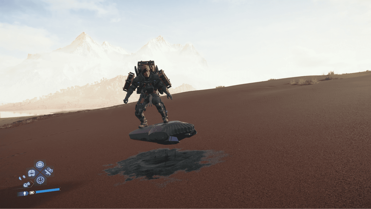 Это самый мощный наземный транспорт. Он не так быстр, как трикрейсер, зато позволяет перевозить огромные объёмы груза, в том числе одновременно с ручной ношей. Позже можно разблокировать специальный мод который собирает ближайшие предметы автоматически. Главный минус — высокая громоздкость и быстрая разрядка при езде по воде.