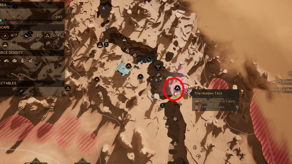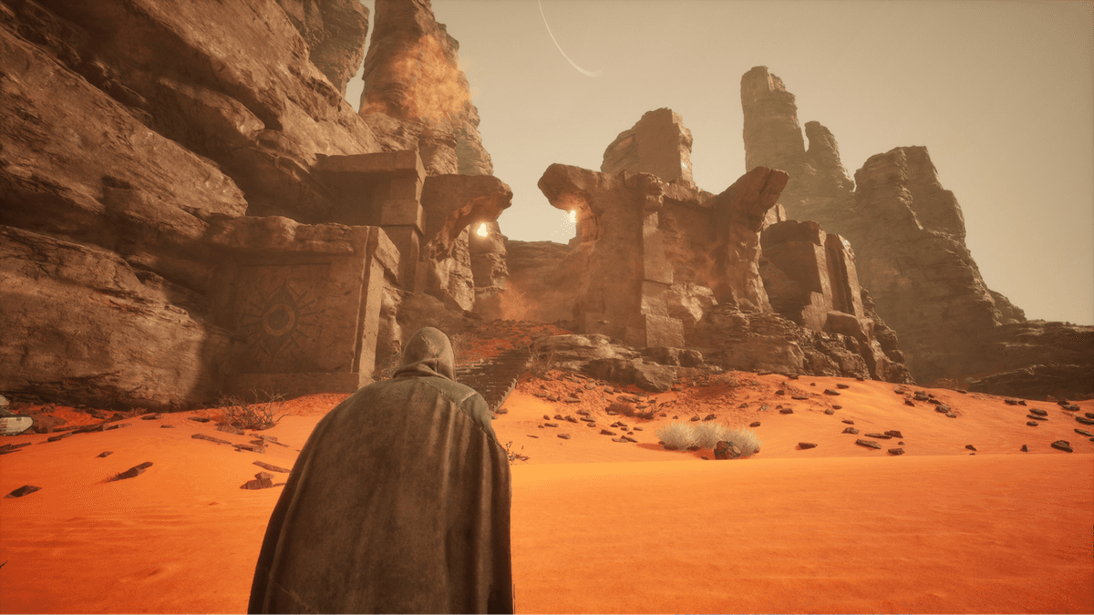 Его можно пройти в процессе выполнения задания «Эхо прошлого». Отправляйтесь в южную часть бассейна Хагга, где нужно взобраться на скалу Вход в пещеру находится на западной стороне. Внутри будьте осторожны: на маршруте встречаются механические сферы-наблюдатели, которые лучше избегать. Пройдя мимо них, вы дойдёте до алтаря. Подойдите и взаимодействуйте — испытание завершено. В награду вы получите схему дистикомба, который помогает сохранять влагу в пустыне, и даёт преимущество в жарких биомах.