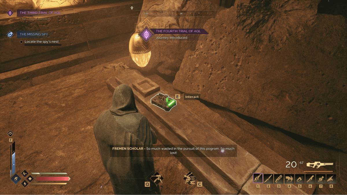 Сложное испытание, доступное только тем, кто способен подняться на массивную скалу в восточной части впадины Вермилия. Используйте орнитоптер или паркур. Подъем возможен с южной стороны, где разрушенные лестницы всё ещё позволяют подняться, зацепившись за уступы. Наверху вы найдёте боевую арену, где после активации алтаря начнётся бой. Против вас выйдут несколько волн NPC с разным вооружением. После победы откроется возможность использовать суперзрение, активируемое при употреблении Спайса. Это состояние усиливает восприятие и боевые реакции персонажа.