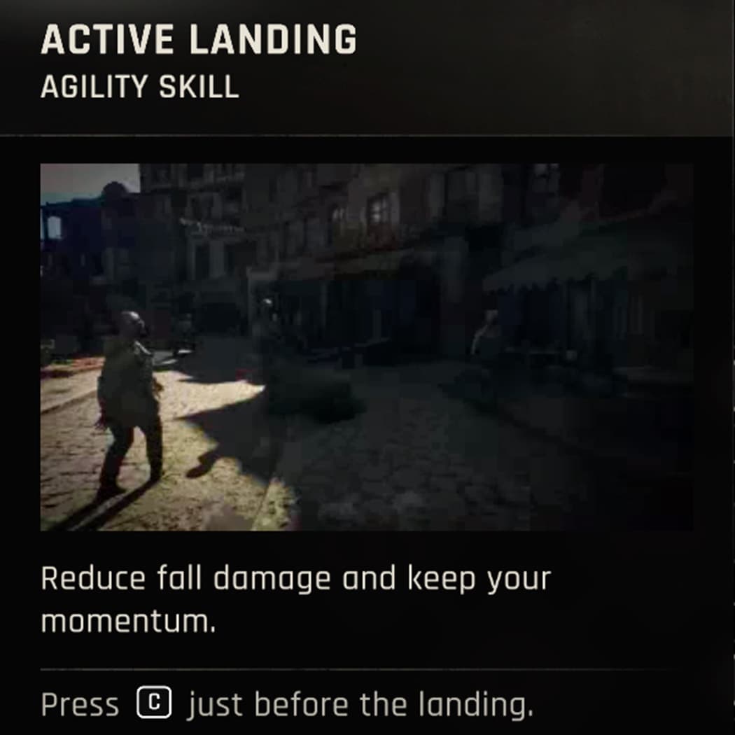 На земле тебя быстро окружат, а по крышам безопаснее и лут жирнее. Ранним приоритетом возьми навык «Активное приземление» — с идеальным таймингом он сильно режет урон от падений и даёт перекат, чтобы сохранить скорость.